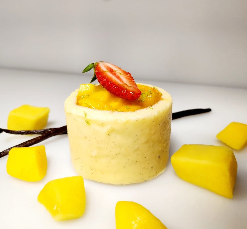 Biscuit chiffon cake, confit mangue passion, mousse allégée Sao palmé vanille, brunoise de mangue