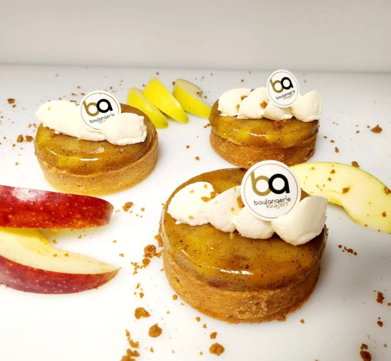 Pâte sablée amandes, Croustillant spéculoos, Crème brûlée vanille, pommes façon tatin