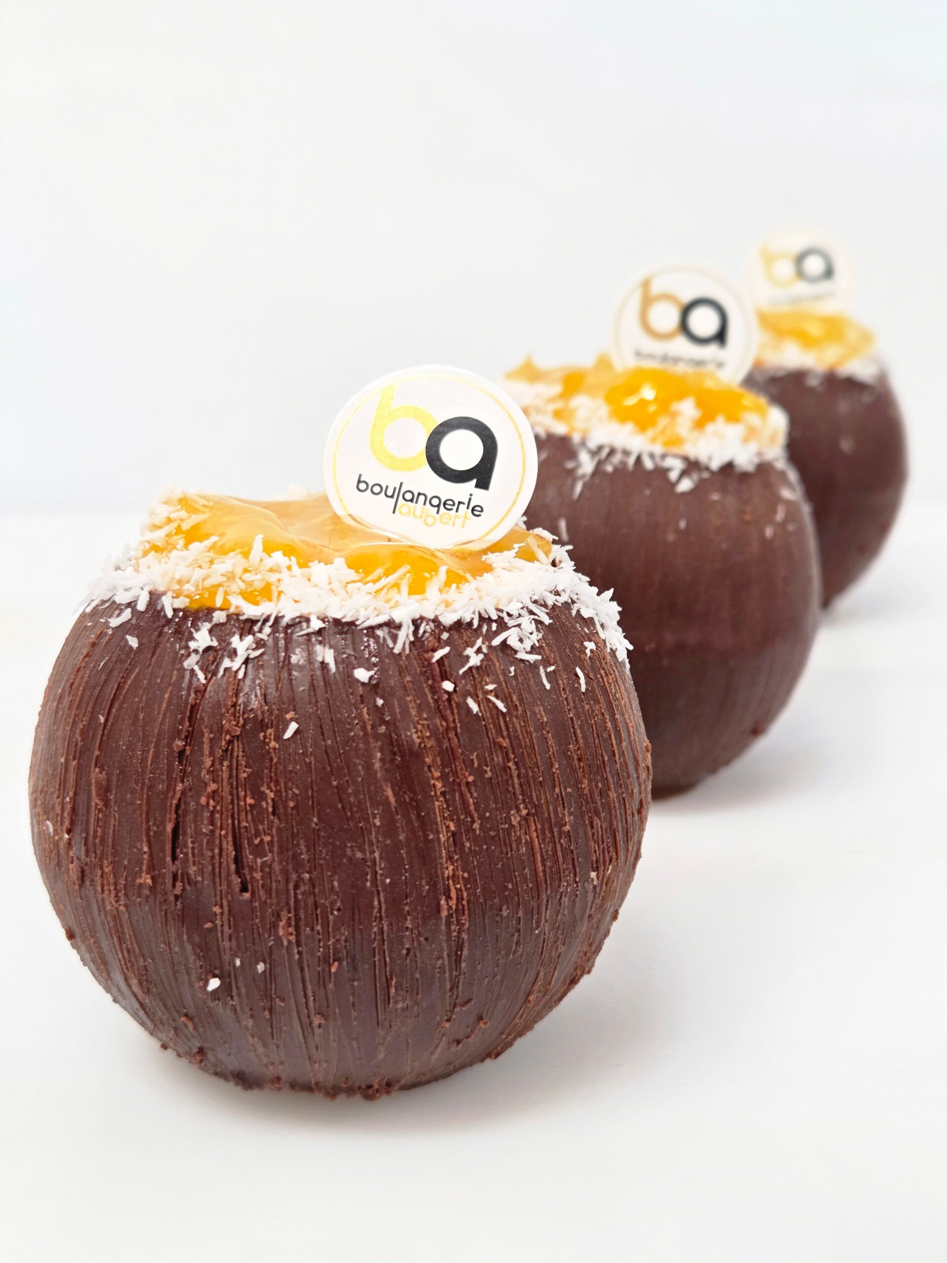 Mousse coco, biscuit madeleine, marmelade exotique, enrobage chocolat noir